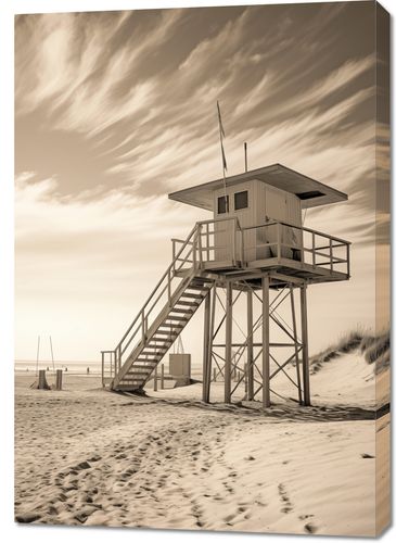 Obraz z serii pejzaże zatytułowany Strażnik Wydm. Prezentuje on sepiową scenę z wieżą ratownika na pustej plaży. Nostalgiczna tonacja obrazu podkreśla samotność struktury i piękno otaczającej ją dzikiej przyrody. Dramatyczne chmury na niebie i ślady na piasku prowadzą wzrok ku wieży, dodając głębi i historii miejscu. Ten obraz idealnie nadaje się do wnętrz, w których pragnie się wywołać uczucie spokoju, przestrzeni i czasów minionych, takich jak salony, pokoje wypoczynkowe, a także przestrzenie publiczne lub prywatne biura, które cenią sobie klasyczny wygląd i atmosferę.