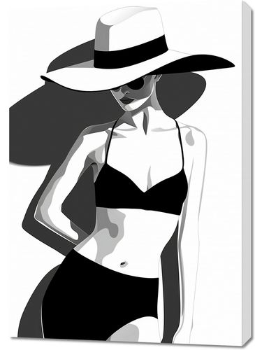 Obraz z serii abstrakcja zatytułowany Strój. Prezentuje stylizowany czarno-biały wizerunek kobiety w dwuczęściowym stroju kąpielowym. Postać odziana jest w szerokobrzmiony kapelusz, który rzuca cień na jej twarz, podkreślając elegancki i tajemniczy charakter kompozycji. Kobieta stoi w pozycji trzy czwarte, z jedną ręką opuszczoną wzdłuż ciała, a drugą lekko zgiętą w łokciu, co dodaje dynamizmu ilustracji. Obraz jest utrzymany w minimalistycznym stylu z wykorzystaniem płaskich plam kolorów i wyraźnych linii, co nadaje mu nowoczesny i modny wygląd. Ten rodzaj grafiki idealnie wpasuje się w nowoczesne wnętrza, szczególnie te o monochromatycznej kolorystyce, lub jako modny akcent w przestrzeniach o minimalistycznej estetyce.