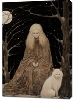 Obraz z serii wnętrza zatytułowany Stróżka Leśna. Ta eteryczna praca artystyczna ukazuje postać kobiecą, owiniętą w szatę z motywem leśnym, zatopioną w kontemplacji pod gałęziami drzew oplecionych przez śnieg i w blasku pełnego księżyca. Jej spokojna obecność i blady odcień skóry kontrastują z ciemnością nocy, a towarzyszący jej biały wilk dodaje elementu dzikości i tajemniczości. Obraz oddaje uczucie spokoju i jedności z naturą, a jednocześnie wzbudza ciekawość dotyczącą ukrytych opowieści i starych legend. Idealny dla miłośników fantastyki, mitologii, oraz tych, którzy pragną wprowadzić do swojego wnętrza elementy oniryczne i magiczne.