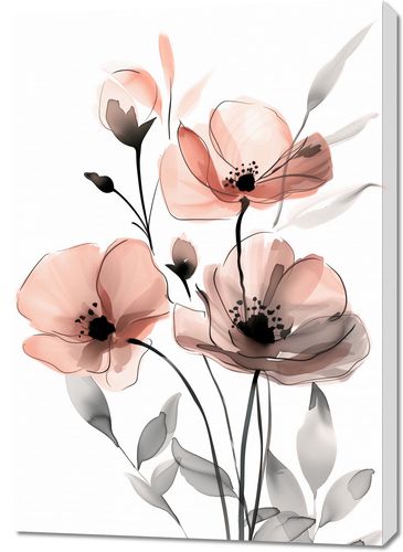 Obraz z serii wnętrza zatytułowany Subtelny Okaz to artystyczna interpretacja delikatnych kwiatów maku. Ilustracja przedstawia kwiaty w pastelowych odcieniach różu i pomarańczy z subtelnymi szarości i akcentami czerni, co nadaje kompozycji miękkiego i eterycznego charakteru. Przezroczyste płatki z lekko zarysowanymi konturami są przedstawione na tle w tonacji jasnego beżu, co pozwala na pełne skupienie na delikatności i pięknie kwiatów. Wykorzystanie minimalizmu i delikatności kolorów sprawia, że obraz emanuje spokojem i elegancją. Idealny do przestrzeni, które cenią sobie spokój i naturę, takich jak salony spa, pokoje gościnne, czy jadalnie, gdzie może dodać odrobinę subtelnego uroku i świeżości.