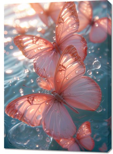 Obraz z serii natura zatytułowany Świetliste Motyle. Na obrazie widzimy delikatne motyle o przezroczystych, różowych skrzydłach, unoszące się nad wodą i łagodnie odbijające światło słoneczne. Kropelki wody na ich skrzydłach dodają uczucia świeżości i czystości. Obraz emanuje spokojem i pięknem, idealnie nadając się do przestrzeni, które chcą wprowadzić element relaksu i spokoju, takich jak spa, pokoje medytacyjne, a także jako łagodny element dekoracyjny do domu.