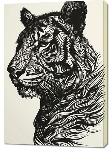 Obraz z serii wnętrza zatytułowany Tygrysi Gwizd. Ta dramatyczna grafika przedstawia tygrysa w stylu linorytu, z wyraźnymi, płynnymi liniami układającymi się w złożony wzór futra. Monochromatyczna paleta, z ciemnymi i jasnymi odcieniami na neutralnym tle, podkreśla majestatyczną postawę i intensywny wzrok tego dzikiego zwierzęcia. Obraz emanuje siłą i elegancją, oddając w pełni królewski charakter tygrysa. Idealny do wnętrz urządzonych w stylu minimalistycznym lub nowoczesnym, będzie także pasował do przestrzeni, które chcą podkreślić motywy przyrodnicze lub eksplorować tematykę ochrony dzikiej przyrody.