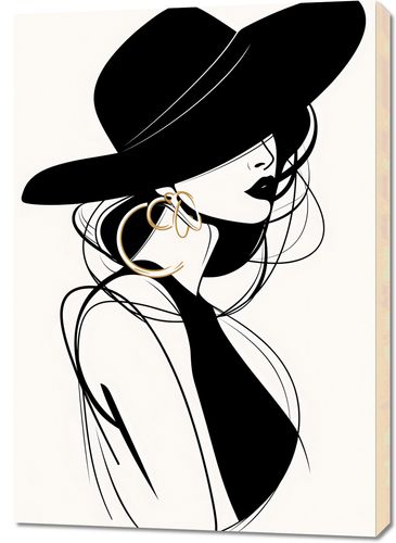Obraz z serii minimalistyczne zatytułowany Uwikłana Elegancja. Grafika przedstawia sylwetkę tajemniczej, eleganckiej postaci w szerokim kapeluszu, co nadaje kompozycji aurę wyrafinowania i gracji. Stylizowany portret, wykonany czernią i bielą z akcentami złota, emanuje klasyką i nowoczesnością. Silny kontrast i płynne linie podkreślają zmysłowy kształt ujęcia oraz wytworność biżuterii, sugerując wyrafinowany gust i pewność siebie modelki. Obraz ten idealnie wpasuje się w eleganckie wnętrza, gdzie klasyka spotyka się z nowoczesnością, doskonale nadając się do salonów, sypialni, garderoby lub jako elegancki akcent w przestrzeniach komercyjnych, takich jak salony piękności czy butiki.