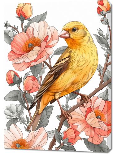 Obraz z serii natura zatytułowany Wiosenny Śpiewaczek przedstawia pełną detali i życia scenę, w której jaskrawo żółty ptak, przypominający kanarka, spoczywa na gałęzi wśród kwitnących kwiatów. Delikatne i subtelne kolory kwiatów w pastelowych odcieniach różu i pomarańczu tworzą miękki kontrast do żywego upierzenia ptaka. Precyzyjne linie i staranne cieniowanie nadają ilustracji realistycznego wyglądu, a roślinność w tle jest równie szczegółowo wykonana, co dodaje kompozycji głębi i bogactwa. Ten obraz to celebracja wiosennego odrodzenia i piękna natury, idealny do ożywienia każdego wnętrza, szczególnie pokoju dziennego, przestrzeni odpoczynkowej lub kawiarni o przytulnej atmosferze.