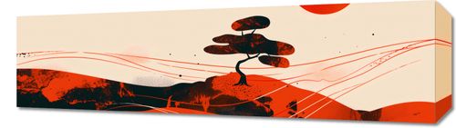 Obraz z serii minimalistyczne zatytułowany Czerwone Pustynne Pejzaże. Praca artystyczna przedstawia stonowany, lecz intensywny krajobraz z dominującymi czerwieniami i pomarańczami, z sylwetką charakterystycznego drzewa na pierwszym planie, co może sugerować inspiracje krajobrazami Afryki lub Australii. Ten obraz to świetny wybór dla wnętrz inspirowanych przyrodą i podróżami, przynoszących element globalnej wędrowki do domowego zacisza. Może dodać dramatyzmu i życia dużym, otwartym przestrzeniom, takim jak salon czy hol.