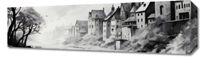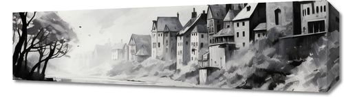 Obraz z serii pejzaże zatytułowany Mglisty Refleks. Misterne pociągnięcia pędzla przedstawiają starą wieś schowaną w mrocznych zakątkach gór, z dominującymi wieżami kościoła wznoszącymi się nad nią. Mgła otulająca krajobraz i odbicie w spokojnej wodzie tworzą atmosferę tajemniczości i zadumy. Monochromatyczna paleta barw dodaje głębi i intensywności całemu obrazowi, czyniąc go idealnym wyborem dla klasycznych salonów oraz miejsc takich jak kawiarnie o historycznym charakterze czy ekskluzywne kluby dyskusyjne.