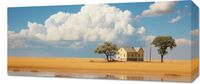 Obraz z serii pejzaże zatytułowany Domostwo, przedstawia idylliczny krajobraz z domem wiejskim, który odzwierciedla siatkę spokoju i prostoty. W centrum sceny znajduje się tradycyjny dom z jasnożółtymi ścianami i dachem w kolorze jasnoszarym, otoczony przez dwa okazałe drzewa oferujące cień i komfort. Płaski, rozległy krajobraz pokryty jest suchą, złotą trawą, która kontrastuje z błękitnym, rozległym niebem usianym puszystymi białymi chmurami. Poniżej, spokojna, błyszcząca tafla wody odbija dom i drzewa, tworząc doskonałe lustrzane odbicie, które dodaje głębi i symetrii kompozycji. Ten obraz przypomina o prostych przyjemnościach życia na wsi, gdzie czas wydaje się płynąć wolniej, a natura jest blisko. Idealnie wpasuje się w przestrzenie, które mają na celu wywołać poczucie spokoju i refleksji, takie jak domowe pokoje wypoczynkowe, gabinety psychoterapeutyczne lub pomieszczenia do medytacji.