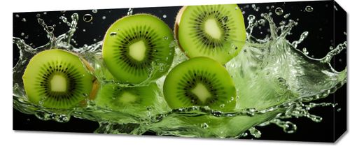 Obraz z serii wnętrza zatytułowany Energia Kiwi, przedstawia dynamiczny moment, gdy plasterki kiwi wchodzą w interakcję z rozpryskującą się wodą, tworząc wizualne spektakulum koloru i ruchu. Jasne zielenie owoców są wyraziste na tle ciemnego tła, a przezroczyste krople wody dodają kompozycji poczucia świeżości. Ten obraz przyciąga uwagę żywiołowością i świeżością, doskonale wpasowując się do przestrzeni, które pragną podkreślić zdrowy styl życia, takich jak kuchnie, jadalnie, studia fitness, spa, a także jako energetyzujący akcent w nowoczesnych biurach lub kawiarniach.