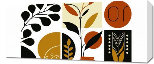 Obraz z serii minimalistyczne zatytułowany Kolaż Botaniczny. Jest to kolekcja geometrycznych i organicznych form przedstawiających motywy roślinne. Kolaż składa się z sześciu prostokątnych i okrągłych paneli, każdy z własnym unikalnym wzorem w paletcie czerni, białego, terakoty i odcieni żółtego. Wzory są proste, lecz estetyczne, z subtelnymi teksturami i liniami.Ten wielopanelowy plakat będzie doskonale komponował się z nowoczesnymi, minimalistycznymi wnętrzami, które cenią sobie sztukę konceptualną. Doskonały dla przestrzeni o neutralnych kolorach ścian, gdzie może służyć jako centralny punkt dekoracyjny.