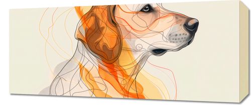 Obraz z serii abstrakcja zatytułowany Kontur Profilowego. Obraz przedstawia portret psa w stylu artystycznym, z subtelnie zaznaczonymi, ale wyraźnymi cechami. Kompozycja łączy realistyczne detale takie jak oczy, nos i uszy z abstrakcyjnymi, płynnymi liniami i plamami kolorów, które tworzą wrażenie ruchu i głębi. Dominujące kolory to odcienie pomarańczowego, żółtego i brązu, które idealnie oddają ciepło i przyjazny charakter zwierzęcia. Tło w neutralnym, pastelowym odcieniu podkreśla i równoważy bardziej dynamiczne elementy grafiki. Obraz emanuje spokojem i może wzbudzać pozytywne emocje, będąc jednocześnie wyrafinowanym, artystycznym przedstawieniem psa, który może być ulubieńcem rodziny lub po prostu przykuwającym uwagę elementem dekoracyjnym.