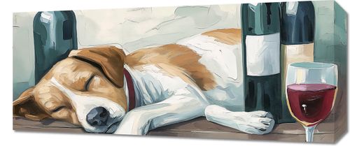 Obraz z serii abstrakcja zatytułowany Leniwe Popołudnie, przedstawia klimatyczną scenę wypoczynku. Na pierwszym planie widzimy spokojnie śpiącego psa, który wygodnie umieścił swoją głowę na drewnianej powierzchni, obok przewróconej butelki wina. Jego biało-brązowe umaszczenie kontrastuje z zielenią i burgundem butelek wina oraz rubinową głębią wina w szklance, dodając obrazowi domowej, przytulnej atmosfery. W tle delikatna tekstura popękanej ściany i dyskretnie rozmieszczone owoce nadają temu dziełu sztuki poczucie spokoju i domowego ciepła. Idealny do wzbogacenia wnętrza winiarni, salonu lub jako centralny punkt w przestrzeni, gdzie chcemy podkreślić miłość do zwierząt i chwile odpoczynku.
