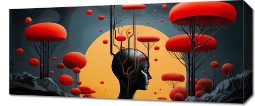Obraz z serii pop art zatytułowany Myślokształty. Ten obraz przedstawia profil człowieka z głową pełną drzew, które wydają się być przedłużeniem jego myśli i świadomości, symbolizując połączenie umysłu z naturą. Drzewa mają formę fantastycznych, czerwonych kształtów przypominających grzyby, a ich rozgałęzienia łączą się z otaczającą atmosferą, z której unoszą się podobne formacje. Kontrastujące kolory, z dominującym czerwieniem i spokojnym tłem, tworzą wizualny dialog między rzeczywistością a wyobraźnią. Obraz zaprasza do refleksji nad bogactwem wewnętrznego świata i jego wpływem na percepcję zewnętrznej rzeczywistości, będąc wyjątkowym dodatkiem do każdego środowiska poszukującego głębi i inspiracji.