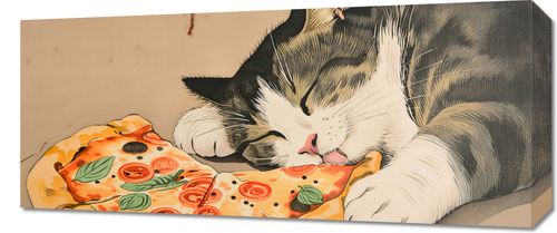 Obraz z serii wnętrza zatytułowany Pizza Dla Kota. Urocze przedstawienie kota w stanie głębokiego relaksu, delektującego się kawałkiem pizzy. Przewrotny humor i ciepło obrazu są podkreślone przez szczegółowe wykonanie, od realistycznej faktury sierści po apetycznie wyglądające plasterki pomidora i liście bazylii na pizzy. Kolory są żywe, ale nieprzesadzone, co nadaje plakatowi przyjemny dla oka, domowy charakter. To dzieło przyniesie uśmiech i doda uroku każdej kuchni czy jadalni, a także może być ciekawym akcentem w pizzerii lub kawiarni. Idealnie wpasuje się w miejsca, które chcą nadać swoim przestrzeniom ciepły, domowy nastrój z odrobiną humoru.