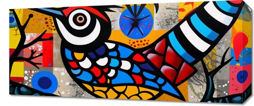 Obraz z serii abstrakcja zatytułowany Ptak Na Wznak. Obraz przedstawia kolorową, dynamiczną ilustrację ptaka w stylu współczesnego, miejskiego graffiti. Ptak ma wyraziste, żarówiasto czerwone, niebieskie i żółte pióra, a jego ciało jest wypełnione wzorami i kształtami, które tworzą wrażenie ruchu i życia. Oczy ptaka są przerysowane, z dużym, hipnotyzującym okiem, które przyciąga uwagę i dodaje charakteru ilustracji. Tło obrazu jest kolażem złożonym z różnorodnych kształtów i tekstur, w tym kropek, linii i abstrakcyjnych form, w paletcie kolorów od jasnych żółci i czerwieni po głębokie błękity i czernie, co nadaje dziełu złożony i dynamiczny charakter. Ten obraz może być interpretowany jako hołd dla street artu, łączący tradycyjną ikonografię ptaka z nowoczesnymi elementami sztuki miejskiej. Idealnie nadawałby się jako dekoracja do nowoczesnych przestrzeni, wprowadzając energię i kreatywność do każdego wnętrza.