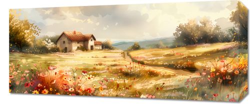 Obraz z serii abstrakcja zatytułowany Sielski Domek. Obraz ukazuje sielski krajobraz wiejski, gdzie dominuje ciepła, rozświetlona słońcem sceneria. Na pierwszym planie rozciąga się żywokolorowy dywan dzikich kwiatów, w którym dominują odcienie czerwieni, różu i bieli, nadając kompozycji żywą i radosną atmosferę. Pośrodku krajobrazu widnieje urokliwy, biały dom z czerwonym dachem, otoczony dojrzewającymi drzewami i łanami zbóż, które delikatnie falują na wietrze. W tle majaczą delikatne sylwetki wzgórz, które dopełniają harmonijny obraz sielanki. Niebo jest przestronne i dramatyczne z miękkimi, białymi chmurami, co nadaje głębi i przestrzeni całej scenie. Ten obraz emanuje spokojem i prostotą życia na wsi, jest jak okno otwierające się na spokojną, bukoliczną ucieczkę, idealne do wnętrz, które mają za zadanie wyciszać i relaksować.