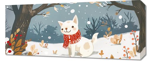 Obraz z serii wnętrza zatytułowany Śnieżny Kompan. Urocze przedstawienie białego, puchatego psa w czerwonym szaliku, który przywołuje ciepłe uczucia w chłodnym, zimowym otoczeniu. Zwierzę z radosnym wyrazem twarzy wydaje się cieszyć spadającymi płatkami śniegu, co dodaje obrazowi poczucia radości i bezpretensjonalnej zabawy. Tło w pastelowych odcieniach bieli i szarości z delikatnymi akcentami kolorystycznymi tworzy spokojną i relaksującą atmosferę. Obraz idealnie nadaje się do dekoracji pomieszczeń dziecięcych, salonów, czy przytulnych kawiarni, wprowadzając do wnętrza element zabawy i niewinności. Jego ciepłe barwy i sympatyczny motyw sprawią, że będzie doskonałym dodatkiem do miejsc, w których chcemy poczuć odrobinę zimowego ciepła i uroku.
