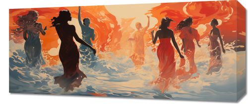 Obraz z serii wnętrza zatytułowany Taneczny Żar, przedstawia grupę osób tańczących w rytmicznych ruchach w wodzie, z tłem zapalającego się nieba w odcieniach ciepłego pomarańczu i czerwieni. Postacie są przedstawione w dynamicznych pozach, z włosami rozwianymi przez wiatr, co nadaje obrazowi wrażenie ruchu i pasji. Styl obrazu, z jego płynnymi liniami i żywymi kolorami, tworzy uczucie energii i życia. Ten obraz idealnie nadaje się do wnętrz, które chcą uchwycić esencję ruchu, radości i wolności, takich jak studia taneczne, kreatywne przestrzenie pracy, a także jako inspirujący element w domach, gdzie może stanowić przypomnienie o pięknie wspólnych chwil i celebracji życia.