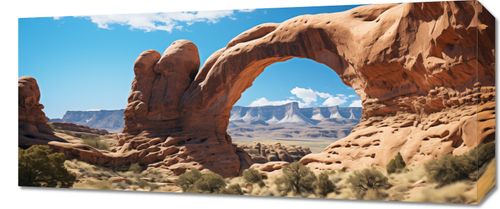 Obraz z serii pejzaże zatytułowany Triumf Natury. Zapierający dech w piersiach widok naturalnej formacji skalnej, która tworzy naturalny łuk, jest świadectwem niezwykłej siły i wytrwałości natury. Ciepłe odcienie pomarańczu i brązu skalnego łuku kontrastują z głębokim błękitem nieba, a delikatne zielone akcenty roślinności dodają życia i głębi kompozycji. Ta scena emanuje siłą i spokojem, stanowiąc doskonałe uzupełnienie dla przestrzeni takich jak współczesne biura, eleganckie pokoje dziennego wypoczynku, a także jako element dekoracyjny w hotelach i miejscach publicznych, gdzie natura spotyka się z designem.