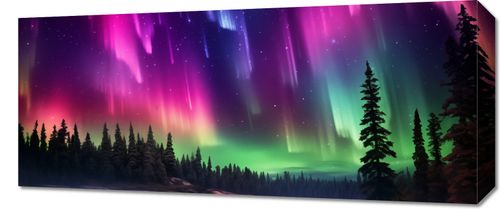 Obraz z serii pejzaże zatytułowany Zorza Nad Lasem. Obraz przedstawia zachwycające zjawisko naturalne – zorzę polarną, rozświetlającą nocne niebo nad spokojnym, leśnym krajobrazem. Niebo rozświetlają pasma światła w odcieniach różu, fioletu, zielonego i niebieskiego, które tworzą tęczowy spektakl. Poniżej, ciemne sylwetki drzew iglastych gęsto pokrywają krajobraz, a ich odbicia rysują się na cichej powierzchni jeziora. Kompozycja emanuje spokojem i majestatem, przywodząc na myśl surowe piękno dzikiej przyrody. Ten obraz idealnie wpasuje się w przestrzenie, które mają na celu wzbudzić uczucie ukojenia i cudów natury, takie jak salony spa, pokoje relaksacyjne lub jako inspirujący element dekoracyjny w domowym wnętrzu.