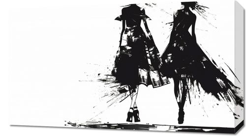 Obraz z serii wnętrza zatytułowany Atramentowy Przerys. Plakat ukazuje dwie stylizowane postacie kobiet w dynamicznej pozie, co nadaje wrażenie ruchu i elegancji. Obraz jest utrzymany w monochromatycznej palety kolorystycznej, gdzie silne kontrasty czerni i bieli tworzą dramatyczny efekt. Postaci są zredukowane do esencjonalnych form i plam atramentu, co przypomina szkice mody z charakterystycznym dla tego gatunku użyciem cienia i światła do zarysowania konturów odzieży i ciała. Energetyczne smugi i plamy atramentu sprawiają, że suknie wydają się falować i poruszać, a zarysowane w sposób abstrakcyjny obcasy dodają całej kompozycji współczesnego wyrazu. Ten obraz mógłby być wspaniałym dodatkiem do przestrzeni o nowoczesnym, artystycznym charakterze, takich jak atelier, modowe salony czy współczesne galerie.