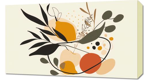 Obraz z serii minimalistyczne zatytułowany Botaniczny Wir. Grafika ta przedstawia elegancką kompozycję stylizowanych elementów roślinnych, które tańczą wśród abstrakcyjnych form i linii. Barwy są ciepłe i przyjemne dla oka, z odcieniami ochry, pomarańczu i czerni, co nadaje dziełu wyjątkową głębię i teksturę. Obraz ten świetnie wpasuje się w przestrzenie, które szukają zarówno spokoju, jak i subtelnej energii. Będzie wyjątkowym dodatkiem do salonów, gabinetów, a nawet jako element wyróżniający w przestrzeniach komercyjnych jak kawiarnie czy butiki. Ożywi wnętrze, zachowując jednocześnie harmonijny i zrównoważony charakter.