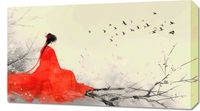 Obraz z serii motywy wschodnie zatytułowany Diva Na Gałęzi. Obraz przedstawia eteryczną scenę utrzymaną w delikatnej palecie barw z przewagą odcieni szarości i bieli, która kontrastuje z wyrazistą czerwienią. Na pierwszym planie widzimy postać kobiety w tradycyjnym, czerwonym stroju, z eleganckim uczesaniem i ozdobami we włosach, co sugeruje kulturalne lub historyczne znaczenie ubioru. Siedzi ona na gałęzi drzewa, a jej sukienka płynnie przechodzi w linie, które mogą symbolizować wiatr lub wodę, dodając grafice dynamiki. Tło jest stonowane i minimalistyczne, z subtelnymi plamami farby tworzącymi delikatną atmosferę. Nad sceną unosi się stado ptaków, które wzbija się do lotu, co może symbolizować wolność lub przejście. Całość kompozycji emanuje spokojem, melancholią i pięknem natury, a także może sugerować opowieść lub głębsze znaczenie skryte w postaci kobiety i jej połączeniu z otoczeniem.