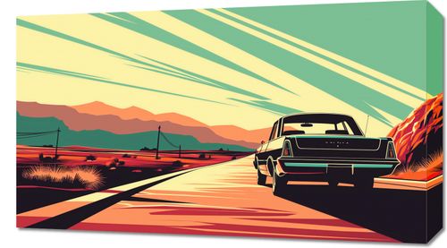 Obraz z serii pop art zatytułowany Droga przez Pustynię. Obraz przedstawia vintage samochód, prawdopodobnie model z lat 60., zaparkowany na pustynnej drodze z widokiem na zachód słońca. Złote i ciepłe odcienie nieba kontrastują z głębokimi cieniami pustyni, dodając głębi i dramatyzmu kompozycji. Design nawiązuje do złotej ery amerykańskich podróży samochodowych, przypominając o wolności i odkrywaniu nieznanych zakątków kraju. Idealnie sprawdzi się jako dekoracja w przestrzeniach inspirowanych vintage, takich jak retro kawiarnie, salony gier, domowe biblioteki, a także jako centralny punkt w salonie dla miłośników stylu mid-century modern.