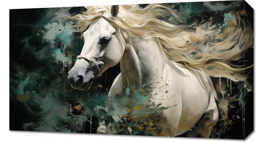 Obraz z serii natura zatytułowany Dziki Duch – dynamiczna i wyrazista kompozycja przedstawiająca arystokratycznego białego konia w pełnym galopie. Kontrast między elegancją czystej bieli sierści konia a dzikim, abstrakcyjnym tłem w odcieniach głębokiego błękitu i czerni podkreśla siłę i energię tego majestatycznego zwierzęcia. Włosy grzywy i ogona konia są przedstawione z niezwykłą szczegółowością, co daje efekt ruchu i życia. Drobne akcenty kolorystyczne w tle dodają dziełu głębi i tekstury, sprawiając, że obraz wydaje się prawie trójwymiarowy. Ten obraz to idealny wybór dla miłośników koni i natury, doskonale wkomponuje się w przestrzenie, które cenią sobie siłę, wolność i piękno natury.