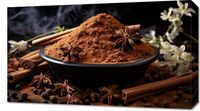 Obraz z serii święta zatytułowany Esencja Aromatu. Mocny akcent na kompozycję przypraw z cynamonem, anyżem i ziarnami pieprzu rozsypanych wokół miski pełnej mielonego cynamonu, tworzący wzór przypominający sztukę natury, wyróżnia się zarówno prostotą, jak i głębią. Delikatny dym unoszący się nad przyprawami dodaje atmosfery ciepła i domowego ogniska. Ten obraz idealnie komponuje się z kuchniami o bogatym, ziemskim wystroju, jak również z eleganckimi restauracjami oferującymi etniczną kuchnię, gdzie podkreśli uczucie przytulności i tradycji.