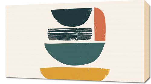 Obraz z serii boho zatytułowany Fale Wodne.Obraz prezentuje minimalistyczne podejście do natury za pomocą abstrakcyjnych, geometrycznych form. Półkoliste i prostokątne kształty w ziemistych tonacjach zieleni, niebieskiego i musztardowego żółcia układają się w spójną kompozycję. Tekstura przypominająca drewno lub fale wodne dodaje głębi centralnie umieszczonemu elementowi, stanowiąc serce i ognisko obrazu. Dzieło to idealnie pasuje do wnętrz, które cenią sobie spokój, równowagę i naturalne motywy, oferując jednocześnie nowoczesny wygląd. Będzie wyjątkowym akcentem w salonach, przestrzeniach biurowych, a nawet jako element uzupełniający w minimalistycznych sypialniach. Obraz może służyć jako wizualny element łączący różne części dekoracji wnętrza.
