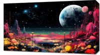 Obraz z serii pejzaże zatytułowany Inny Świat. Obraz ukazuje przepiękny, fantastyczny krajobraz, który łączy elementy kosmiczne z bujną, ziemską florą. Na pierwszym planie widzimy różnorodne, kolorowe kwiaty, które tworzą żywą, wręcz surrealną tapiserię natury. Za tym kwiatowym morzem rozciąga się widok na spokojne jezioro i majestatyczne, czerwone formacje skalne, które przywodzą na myśl marsjański krajobraz. W tle góruje olbrzymi księżyc, który dominuje na nocnym niebie pełnym gwiazd, a obok niego widnieje zarys konstelacji, dodając głębi i tajemniczości całej scenie. Obraz ten jest zaproszeniem do świata wyobraźni, gdzie natura i kosmos spotykają się w harmonii. Idealnie nadawałby się jako dekoracja do nowoczesnych przestrzeni mieszkalnych lub miejsc publicznych, które pragną wzbogacić swoje otoczenie o elementy fantastyczne i inspirujące do snucia marzeń.