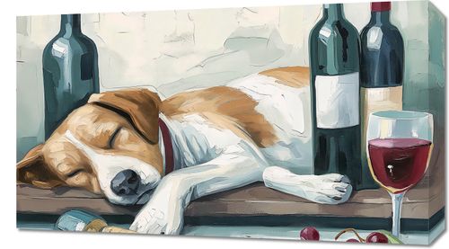 Obraz z serii abstrakcja zatytułowany Leniwe Popołudnie, przedstawia klimatyczną scenę wypoczynku. Na pierwszym planie widzimy spokojnie śpiącego psa, który wygodnie umieścił swoją głowę na drewnianej powierzchni, obok przewróconej butelki wina. Jego biało-brązowe umaszczenie kontrastuje z zielenią i burgundem butelek wina oraz rubinową głębią wina w szklance, dodając obrazowi domowej, przytulnej atmosfery. W tle delikatna tekstura popękanej ściany i dyskretnie rozmieszczone owoce nadają temu dziełu sztuki poczucie spokoju i domowego ciepła. Idealny do wzbogacenia wnętrza winiarni, salonu lub jako centralny punkt w przestrzeni, gdzie chcemy podkreślić miłość do zwierząt i chwile odpoczynku.