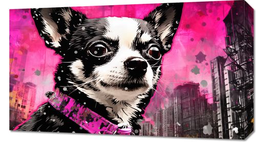 Obraz z serii pop art zatytułowany Mały Psiak o Dużej Duszy. Obraz przedstawia portret Chihuahua z intensywnym, przejmującym spojrzeniem. Pies ma charakterystyczną czarno-białą sierść, a jego oczy zdają się obserwować coś poza ramą obrazu. Ubrany jest w różową, stylową obrożę, co dodaje mu uroku. Tło w kolorze żywej magenty z elementami miejskiego krajobrazu nadaje całości miejski i nowoczesny charakter. Grafika łączy w sobie elementy realizmu z pop-artem, co sprawia, że jest ona żywa i dynamiczna. Ten obraz byłby idealnym dodatkiem do wnętrz o współczesnym designie, zwłaszcza dla miłośników zwierząt lub jako akcent kolorystyczny w modnym, miejskim mieszkaniu.
