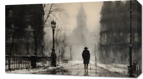 Obraz z serii wnętrza zatytułowany Mgła nad Londynem, przedstawia samotną sylwetkę przechadzającą się po mokrych, połyskujących bruku ulic, otoczoną przez klasyczne kamienice i latarnie uliczne, które rzucają cień na mglistą scenę. Szarości i sepii użyte w dziele podkreślają jego vintage charakter, a zarys wieży w tle przywołuje ikoniczny obraz Londynu. To dzieło sztuki idealnie wpasuje się w przestrzenie, gdzie chce się wywołać atmosferę tajemniczości i klasyki, takie jak biblioteki, salony w stylu retro, czy klasyczne biura prawnicze, zapewniając im wyrafinowany, metaforyczny akcent.