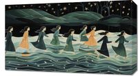 Obraz z serii wnętrza zatytułowany Nocna Procesja, przedstawia sylwetki kobiet, idących w rytmicznym ruchu przez wody, pod tajemniczym, gwiaździstym niebem. Styl obrazu, z płynnymi liniami i miękkimi pastelowymi kolorami, tworzy uczucie spokoju i onirycznej atmosfery. Postacie są przedstawione w ruchu, z włosami rozwianymi przez nocny wiatr, co dodaje dziełu poczucia tajemnicy i ruchu. Ten obraz idealnie nadaje się do wnętrz, które chcą wyrazić poczucie spokoju, introspekcji oraz kobiecej siły i solidarności, takich jak prywatne biblioteki, pokoje medytacyjne, a także przestrzenie publiczne, które pragną inspirować swoich gości do głębszego zastanowienia się nad otaczającym ich światem.