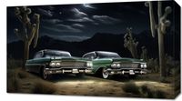 Obraz z serii wnętrza zatytułowany Nostalgiczne Spotkanie ukazuje dwa klasyczne samochody z lat 50., zaparkowane bok w bok pod rozgwieżdżonym nocnym niebem. W tle majestatyczne, ciemne góry rysują się na horyzoncie, a pomiędzy nimi a samochodami rozpościera się dzika pustynna sceneria, z charakterystycznymi kaktusami saguaro. Oświetlone przez delikatne światło księżyca, pojazdy prezentują swoje błyszczące, zadbane karoserie, które odbijają blask gwiazd. Scena ta emanuje spokojem i bezczasowością, przywołując wspomnienia podróży i przygód z minionych epok. Ten obraz doskonale odnajdzie się w przestrzeniach miłośników motoryzacji, retro kawiarniach lub jako elegancki akcent w salonach domowych, inspirując do marzeń o podróży przez historię i amerykański krajobraz.