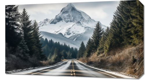 Obraz z serii pejzaże zatytułowany Odważna Podróż, przedstawia majestatyczną górę wyłaniającą się z pośród ciemnozielonych drzew iglastych, które wyznaczają drogę prowadzącą w kierunku jej śnieżnego szczytu. Siła i niezachwiana postawa góry w połączeniu z miękkimi konturami puchowych chmur nad nią tworzą doskonałą równowagę między wytrwałością a delikatnością. Czarna, wilgotna nawierzchnia drogi, rozświetlona światłem odbijającym się od jej wilgotnej powierzchni, prowadzi wzrok obserwatora wprost do serca dzikiej przyrody. Kontrast między ciemnymi drzewami a bielą śniegu dodaje dziełu głębi i tajemniczości. Ten obraz będzie idealnym dodatkiem do wnętrz o tematyce przygodowej i eksploracyjnej, jak również doskonałym wyborem dla przestrzeni biurowych firm turystycznych lub agencji podróżniczych, gdzie może inspirować i przypominać o majestacie i pięknie niezbadanych zakątków świata.