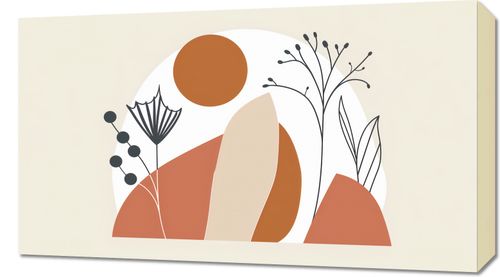 Obraz z serii boho zatytułowany Organiczny Splot. Obraz składa się z serii organicznie ułożonych form i linii, które wspólnie tworzą abstrakcyjną interpretację pejzażu przyrodniczego. Centralnym elementem jest duże, okrągłe słońce w ciepłym, rustykalnym odcieniu pomarańczu, które rozświetla scenę. Pod nim rozmieszczone są wzory roślinne o delikatnych konturach i bardziej intensywnej czerni, które wyłaniają się z zaokrąglonych wzgórz w odcieniach brązu i beżu. Te botaniczne elementy nadają kompozycji dynamiki, tworząc przy tym wrażenie głębi i struktury. Obraz wydaje się oddawać spokój i urok naturalnego krajobrazu, idealnie nadając się do przestrzeni, które pragną przywołać odrobinę natury wewnątrz, takich jak minimalistyczne salony, spokojne przestrzenie biurowe, czy przytulne zakątki domowego zacisza.