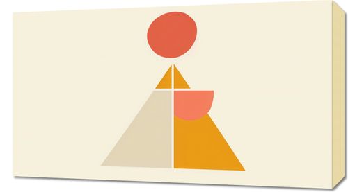 Obraz z serii boho zatytułowany Piramida Równowagi.Na obrazie widnieje uproszczona, ale wyrazista kompozycja geometryczna, składająca się z trójkąta podzielonego na mniejsze sekcje, półkola oraz kółka na szczycie. Kolorystyka utrzymana w pastelowych odcieniach beżu, pomarańczy i czerwieni, wprowadza poczucie ciepła i spokoju.Dzieło idealnie wpisuje się w minimalistyczne i nowoczesne przestrzenie, stanowiąc zarazem element medytacyjny jak i dekoracyjny. Dopełnieniem mogą być proste, drewniane ramy, które podkreślą naturalność prezentowanej formy. Jest to obraz, który może znaleźć swoje miejsce w domowym biurze, salonie, a nawet w przestrzeniach komercyjnych, takich jak kawiarnie lub poczekalnie.