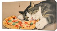 Obraz z serii wnętrza zatytułowany Pizza Dla Kota. Urocze przedstawienie kota w stanie głębokiego relaksu, delektującego się kawałkiem pizzy. Przewrotny humor i ciepło obrazu są podkreślone przez szczegółowe wykonanie, od realistycznej faktury sierści po apetycznie wyglądające plasterki pomidora i liście bazylii na pizzy. Kolory są żywe, ale nieprzesadzone, co nadaje plakatowi przyjemny dla oka, domowy charakter. To dzieło przyniesie uśmiech i doda uroku każdej kuchni czy jadalni, a także może być ciekawym akcentem w pizzerii lub kawiarni. Idealnie wpasuje się w miejsca, które chcą nadać swoim przestrzeniom ciepły, domowy nastrój z odrobiną humoru.