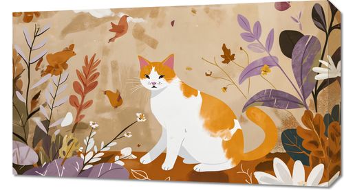 Obraz z serii abstrakcja zatytułowany Pospolita Krasa. Prezentuje on biało-rudego kota o bystrym spojrzeniu, wtapiającego się w pastelowy krajobraz pełen delikatnych kwiatów i latających ptaków. Jego łagodna postawa i miękkość linii kontrastują z żywiołowym tłem, dodając mu charakteru i głębi. Scena ta sprawdzi się w przestrzeniach, gdzie chcemy dodać odrobiny spokoju i natury, jak salony, pokoje relaksu, a także jako element dekoracyjny w klinikach weterynaryjnych lub sklepach zoologicznych, podkreślając bliskość ze światem zwierząt.
