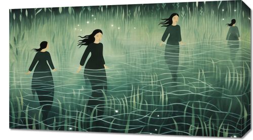 Obraz z serii wnętrza zatytułowany Pośród Ciszy, przedstawia grupę postaci kobiecych, poruszających się z gracją przez mglisty, oniryczny krajobraz. Zanurzone po kolana w wodzie, otoczone przez zielone, eteryczne trawy i dyskretnie świecące światła, postacie emanują spokojem i tajemniczością. Styl obrazu, z jego płynnymi liniami i spokojnymi odcieniami zieleni, tworzy uczucie medytacyjnej głębi i harmonii z naturą. Ten obraz idealnie nadaje się do wnętrz, które pragną odzwierciedlić głęboką spokojność i introspekcję, takich jak pokoje medytacyjne, strefy relaksu, domowe biblioteki, a także jako subtelny akcent w przestrzeniach publicznych, gdzie zachęca do chwili wytchnienia i refleksji.