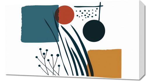 Obraz z serii minimalistyczne zatytułowany Przerys nad Treścią. Obraz przedstawia abstrakcyjną kompozycję geometrycznych kształtów i linii w bogatej palecie barw. Po lewej stronie dominuje duża, teksturalna bryła w kolorze ciemnoturkusowym, która balansuje kompozycję. Po prawej stronie widzimy zestawienie okrągłych form: mniejsza, ciepła pomarańczowa kula nakłada się na większy, głęboki czarny krąg. Pomiędzy nimi rozwijają się liniowe ilustracje roślin, które wydają się tańczyć na wietrze. Tło plakatu jest pastelowym beżem, a delikatne kropki i kreski dodają dynamiki. Ten obraz doskonale wkomponuje się w nowoczesne przestrzenie biurowe, minimalistyczne salony lub stylowe miejskie kawiarnie. Jego spokojne, lecz wyraziste barwy będą idealnie współgrać z czystymi, jasnymi przestrzeniami, oferując jednocześnie subtelny akcent kolorystyczny.