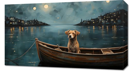 Obraz z serii wnętrza o nazwie Przygoda o Północy, ukazuje wzruszający obraz psa o przenikliwym spojrzeniu, siedzącego samotnie w łodzi na tle tajemniczego miasta. Oświetlone latarniami uliczki nadbrzeżnego miasteczka tworzą tło, które mieni się złotem i błękitem w spokojnych wodach portu, nadając scenie element magii i spokoju. Pies, o czujnym wzroku i szlachetnej postawie, jest przedstawiony z niezwykłą dbałością o detale, co sprawia, że wydaje się być bohaterem nieznanego, ale pociągającego opowiadania. Jego obecność w łodzi dodaje kompozycji głębi emocjonalnej, sugerując wierność i oczekiwanie. Plakat ten wprowadzi do każdego wnętrza element spokoju i refleksji, idealnie pasując do przestrzeni wypełnionych ciepłem i nostalgicznym urokiem, takich jak przytulne salony, kawiarnie, czy miejsca odpoczynku.