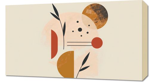 Obraz z serii boho zatytułowany Przyrost do Tła.Obraz przedstawia abstrakcyjną kompozycję złożoną z prostych, geometrycznych form i roślinnych motywów. Dominują tutaj ciepłe odcienie pomarańczowego, różu i brązu, które mieszają się z czernią i beżem. Na pierwszym planie mamy elementy roślinne, które mogą przypominać liście lub gałązki, zaś w tle znajdują się różnej wielkości i faktury koła. Całość jest stylizowana i uproszczona, co daje efekt współczesnego, designerskiego dzieła sztuki. Plakat może inspirować poczuciem spokoju i natury, jednocześnie zachowując modernistyczne uczucie. Idealnie wpasuje się w nowoczesne wnętrze jako centralny punkt dekoracyjny lub delikatne uzupełnienie estetyczne.