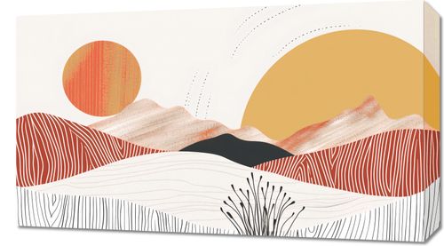Obraz z serii boho zatytułowany Roztańczone Słońce. Obraz przedstawia abstrakcyjny pejzaż, w którym harmonia form i kolorów tworzy obraz pełen spokoju i równowagi. Jego głównymi elementami są stylizowane wzgórza, które płynnie przechodzą w miękkie linie, oraz dwa słońca, które swymi barwami ożywiają całą kompozycję. Delikatna roślinność w przedniej części dodaje głębi i tekstury, a zabawa cieniem i światłem wydobywa z obrazu uczucie ciepła.Ten obraz będzie doskonałym dodatkiem do wnętrz, gdzie pragnie się stworzyć atmosferę spokoju i odpoczynku, takich jak salony, gabinety lub pokoje gościnne. Jego subtelne barwy i proste formy wprowadzą do każdej przestrzeni odrobinę natury i ciepła.