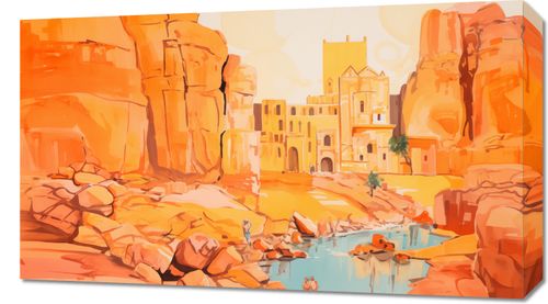 Obraz z serii abstrakcja zatytułowany Ruiny pod Słońcem. Ta ilustracja przedstawia scenę z antycznymi ruinami w ciepłej, pastelowej palecie kolorów, która oddaje odczucie spiekoty i światła słonecznego. Zarysy starożytnej architektury wyrastają z pustynnego krajobrazu, nadając scenerii poczucie wieczności i historii. Odbicie wody i subtelne sylwetki postaci w tle wprowadzają ludzki wymiar do tej scenerii, sugerując trwającą obecność i ciągłość cywilizacji. Obraz ten idealnie wprowadzi do każdego wnętrza element przygody i odkryć, inspirowany podróżami i historią, idealny dla przestrzeni publicznych, biur podróży, a także jako dekoracja w domach miłośników historii.
