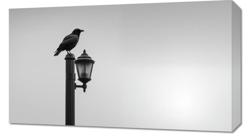 Obraz z serii wnętrza zatytułowany Samotny Postój Kruka. Prezentuje on sylwetkę kruka spoczywającego na klasycznej latarni ulicznej, uchwyconą w monochromatycznej palecie szarości. Ten spokojny, lecz sugestywny obraz jest symbolem refleksji i tajemnicy, doskonale wpisując się w klimat współczesnych przestrzeni miejskich. Praca ta z pewnością stanie się wyrazistym dodatkiem do nowoczesnych wnętrz, takich jak lofty czy minimalistyczne salony, a także wniesie element zastanowienia do przestrzeni publicznych takich jak galerie, kawiarnie i biblioteki, gdzie odosobnienie miesza się z miejskim zgiełkiem.