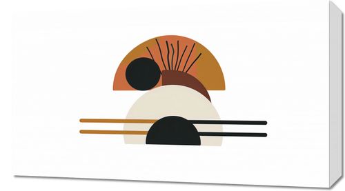 Obraz z serii boho zatytułowany Słońce i Cień. Obraz przedstawia zestawienie półkoli i geometrycznych kształtów, które razem tworzą interpretację astronomicznego zjawiska. Na górze mamy półkoło w ciepłych odcieniach pomarańczu z czarnym dyskiem, które przywodzi na myśl słońce częściowo zakryte przez księżyc podczas zaćmienia. W centrum dominuje większe półkoło w kolorze kości słoniowej, stanowiące tło dla pozostałych elementów. Przez środek obrazu przebiegają równoległe linie, które mogą symbolizować równonoc lub zmianę pór roku. Całość kompozycji wydaje się balansować na granicy światła i cienia, tworząc estetycznie przyciągający i spokojny obraz. Doskonale odnajdzie się na ścianach w nowoczesnych przestrzeniach życiowych, biurach z konceptem open space, a także jako ozdoba w holach i poczekalniach, gdzie geometryczne formy mogą stać się punktem skupienia i medytacji.