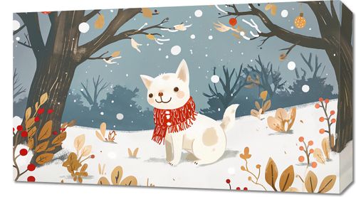 Obraz z serii wnętrza zatytułowany Śnieżny Kompan. Urocze przedstawienie białego, puchatego psa w czerwonym szaliku, który przywołuje ciepłe uczucia w chłodnym, zimowym otoczeniu. Zwierzę z radosnym wyrazem twarzy wydaje się cieszyć spadającymi płatkami śniegu, co dodaje obrazowi poczucia radości i bezpretensjonalnej zabawy. Tło w pastelowych odcieniach bieli i szarości z delikatnymi akcentami kolorystycznymi tworzy spokojną i relaksującą atmosferę. Obraz idealnie nadaje się do dekoracji pomieszczeń dziecięcych, salonów, czy przytulnych kawiarni, wprowadzając do wnętrza element zabawy i niewinności. Jego ciepłe barwy i sympatyczny motyw sprawią, że będzie doskonałym dodatkiem do miejsc, w których chcemy poczuć odrobinę zimowego ciepła i uroku.
